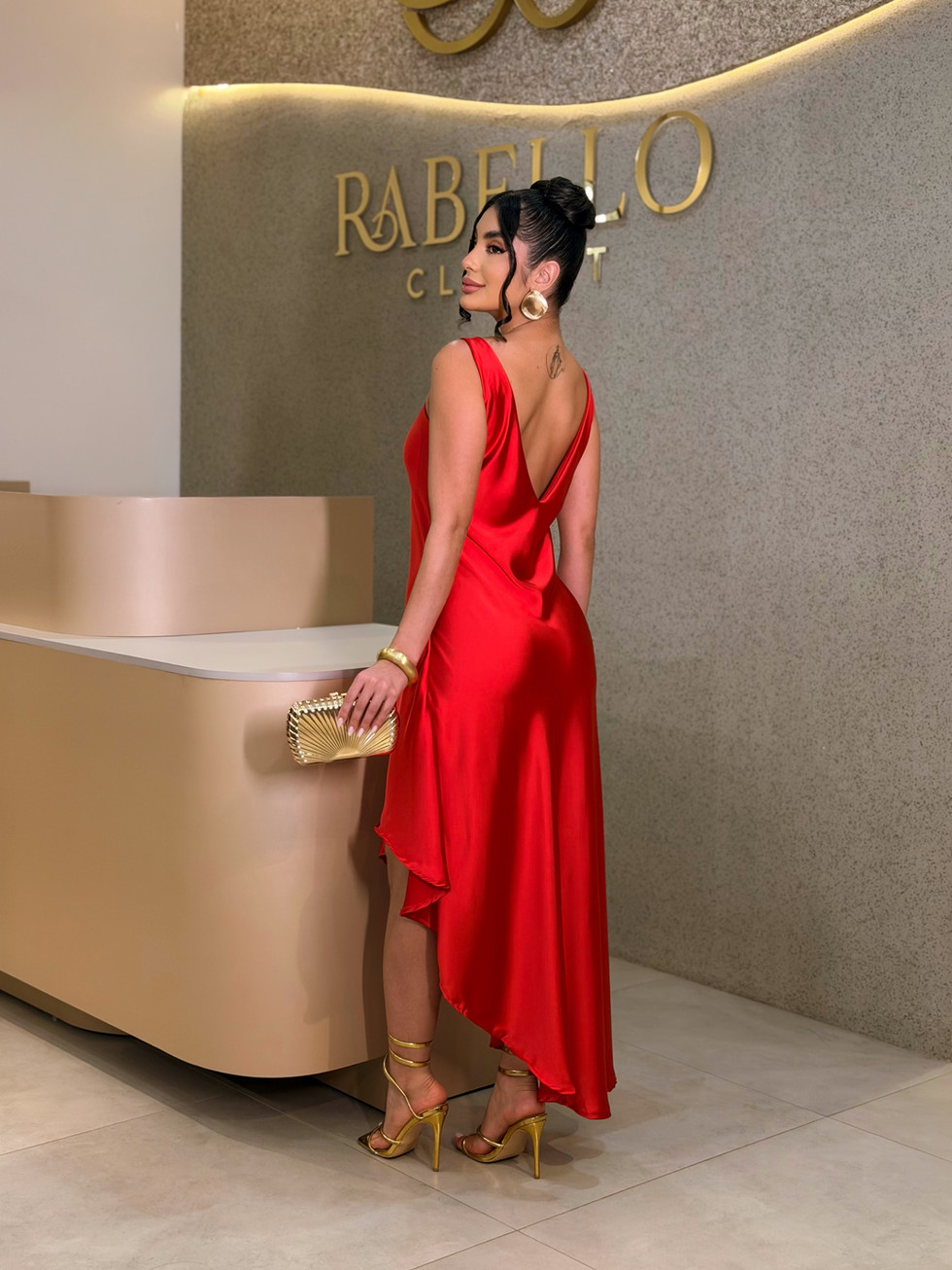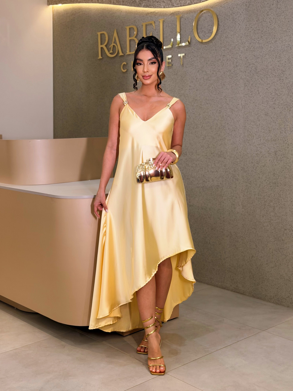 Acessórios dourados ou minimalistas valorizam ainda mais o brilho suave do cetim.