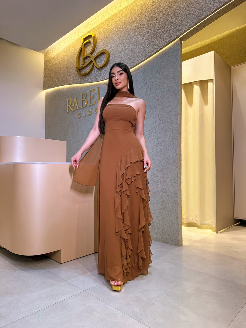 Confeccionado em chiffon leve e fluido, ele combina movimento, feminilidade e sofisticação em cada detalhe. Sua modelagem tomara que caia com lemco opcional permite versatilidade, podendo ser usada de diferentes formas, como echarpe ou faixa sobre os ombros, garantindo um visual encantador em qualquer ocasião.