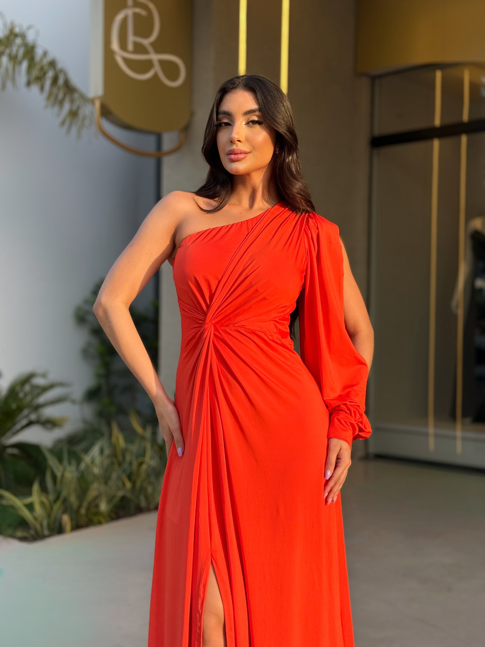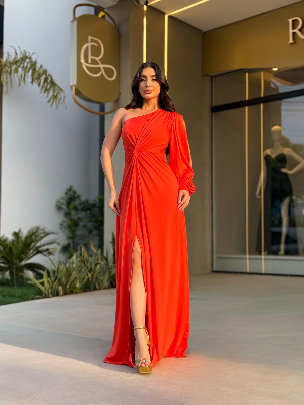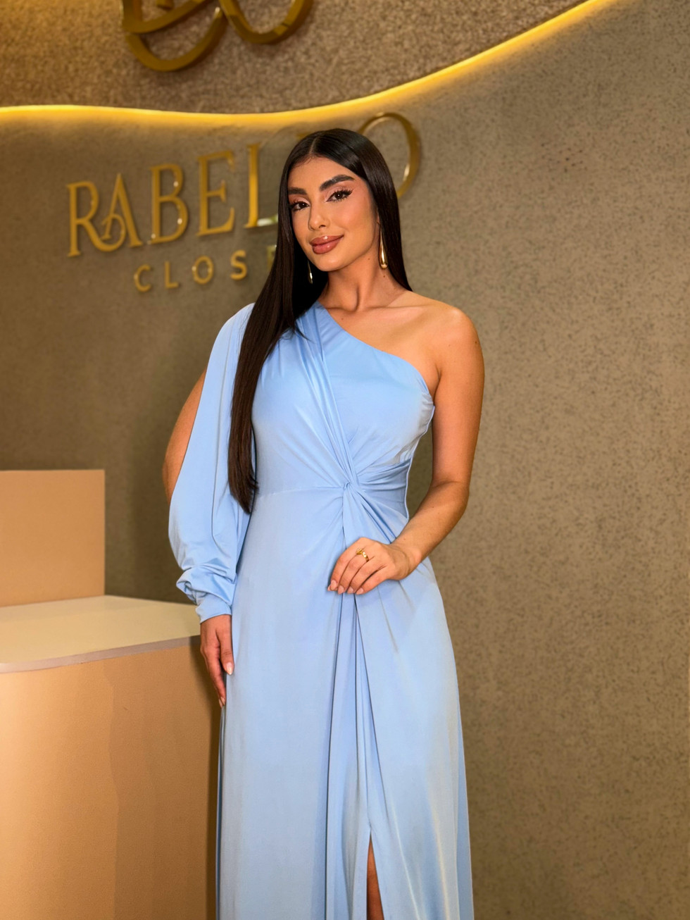 Com um ombro só e fenda frontal, o modelo equilibra sensualidade e refinamento, ideal para ocasiões especiais em que você deseja se destacar com charme e confiança.