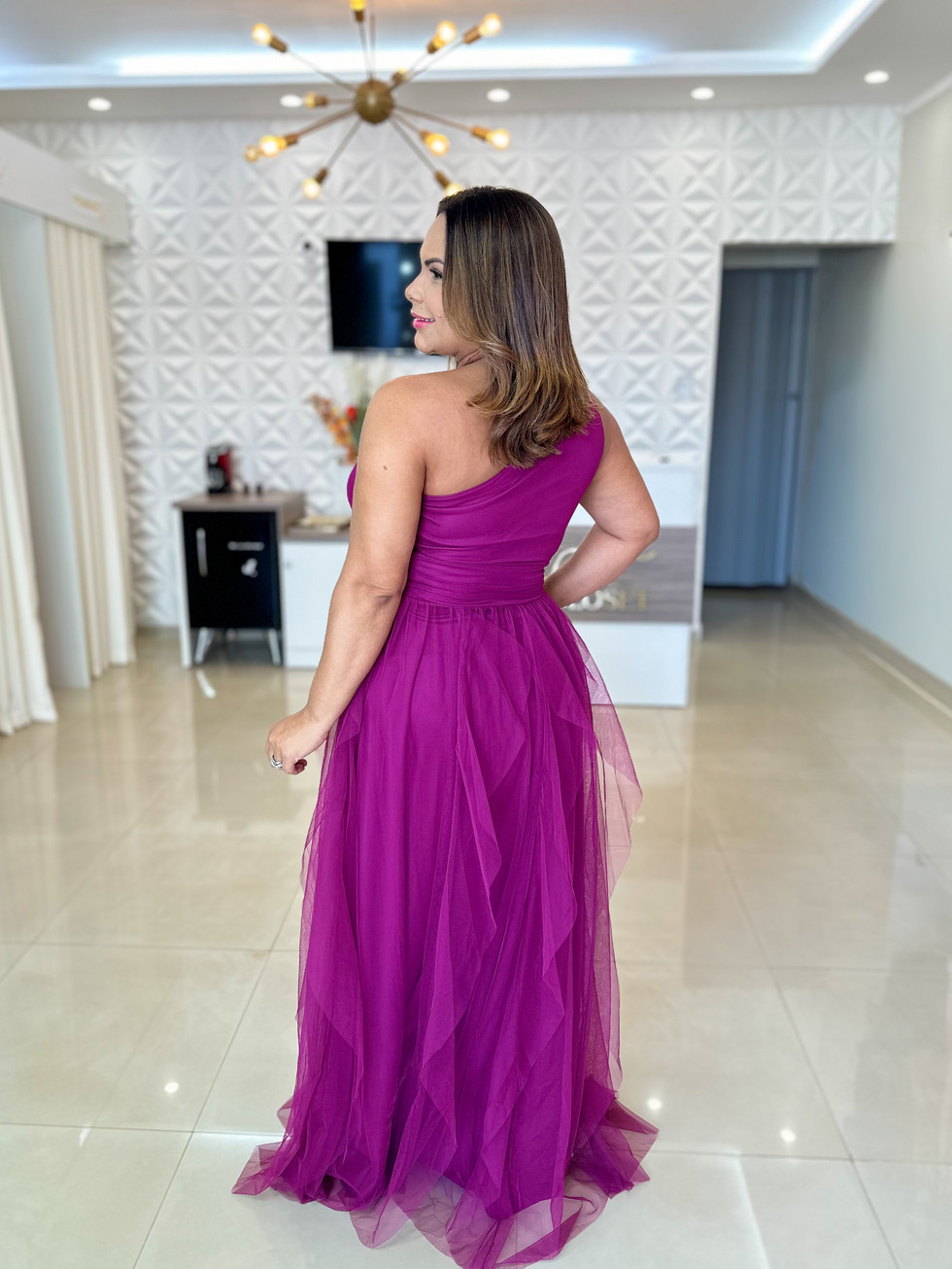 O Vestido Manu é a tradução perfeita de elegância, romantismo e presença. Confeccionado em tule delicado com ou sem brilho, o modelo encanta pelo caimento fluido e pelo design moderno de um ombro só, que valoriza a silhueta e transmite sofisticação em cada movimento.