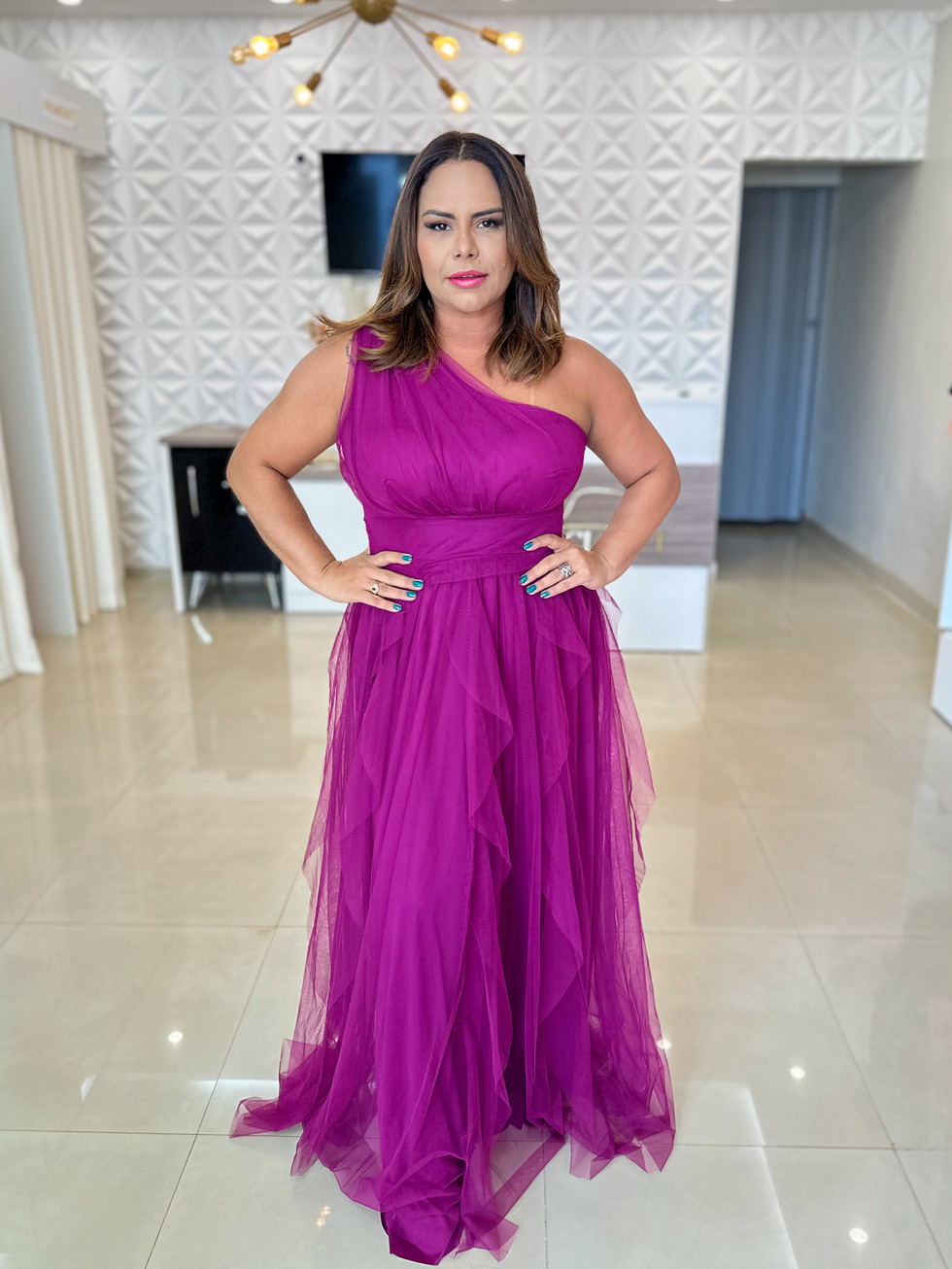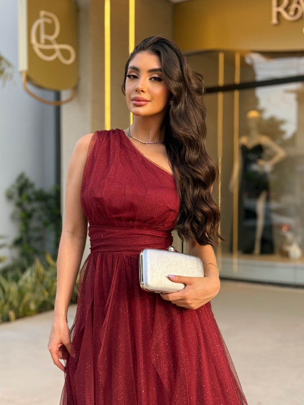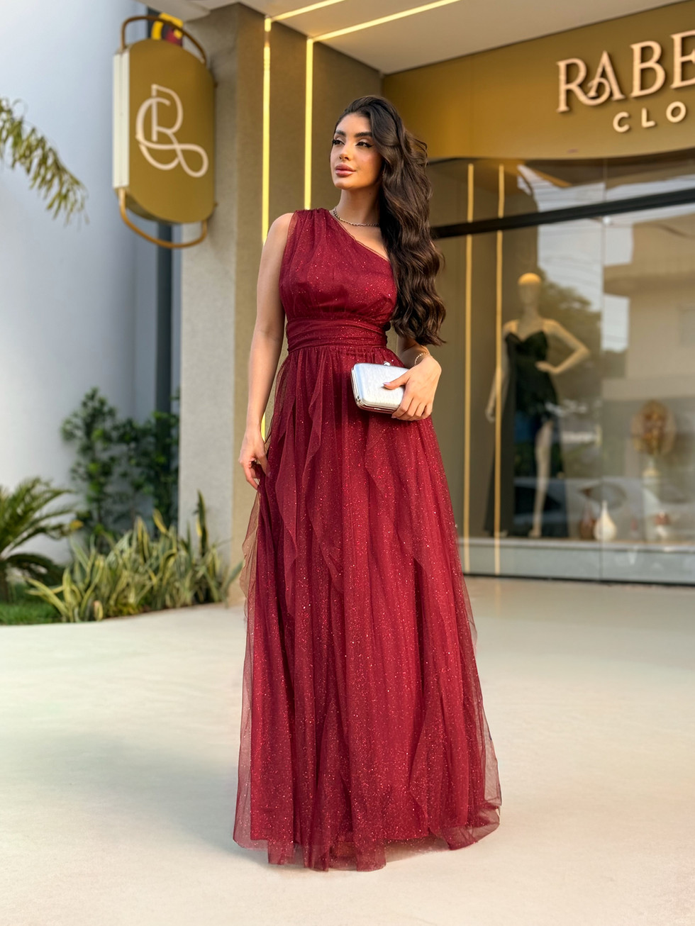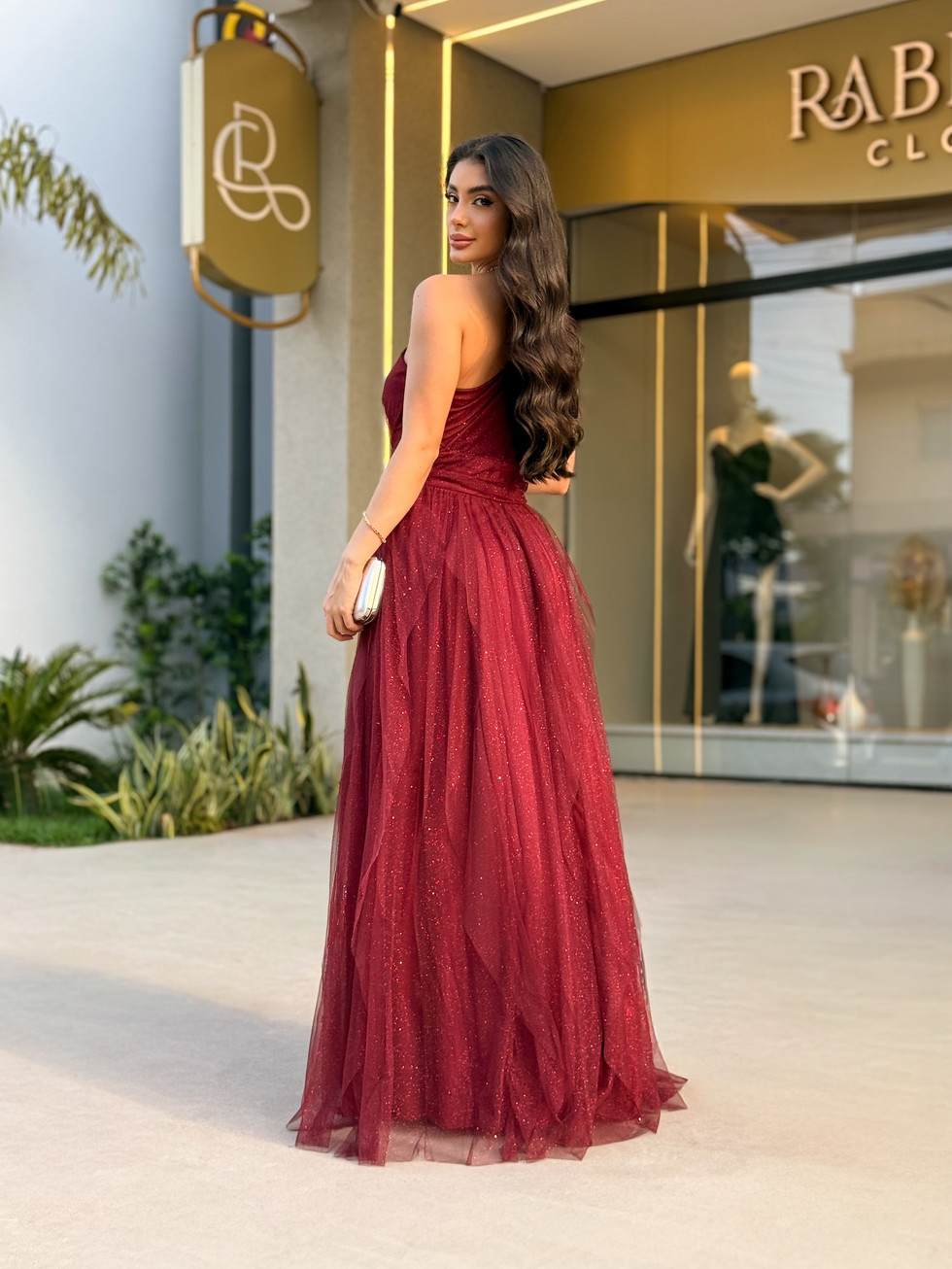A cintura bem marcada define o corpo com sutileza, enquanto a saia em camadas estilo cascata cria um visual leve e envolvente. Ideal para madrinhas, formandas e convidadas que desejam brilhar com classe em eventos noturnos ou ao entardecer.